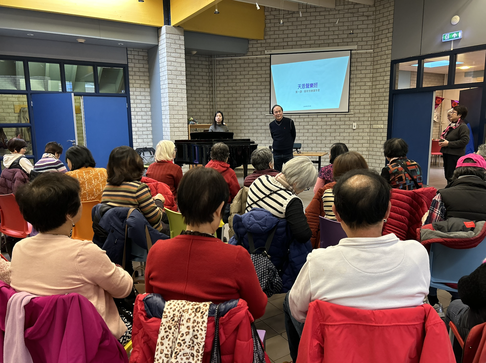 Intussen nemen de ouderen in een aangrenzende zaal plaats voor het muzikale programma. Daar staan drie rijen kleurrijke stoelen opgesteld, met links van de ingang een grote zwarte piano. Zangdocent Kitty Lai opent de bijeenkomst met een stemwarming-up. Daarna verschijnt op een groot scherm de tekst van de liedjes. Wanneer Kitty de eerste toetsen aanslaat, draagt haar stem moeiteloos door de zaal. Eerst zingt zij alleen, daarna doen de ouderen mee waardoor alle stemmen samen vallen tot een mooi koor. Helemaal rechts op de eerste rij zit een man die met zichtbaar enthousiasme meedoet. Hij tikt zacht met zijn voeten mee op het ritme en begeleidt de muziek met kleine handgebaren. De ruimte vult zich met een sfeer van saamhorigheid en warmte en de liedjes roepen bij een groot deel nostalgie op.