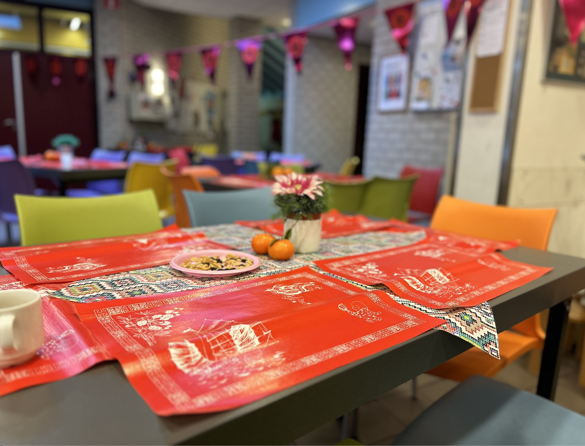 Terwijl de ouderen hun slotnummer zingen, staat de kantine nu helemaal klaar voor hun komst. Een lange slinger met het karakter van geluk hangt door de ruimte en op alle tafels liggen rode placemats met daarop een hongkongse drakenboot afgebeeld.